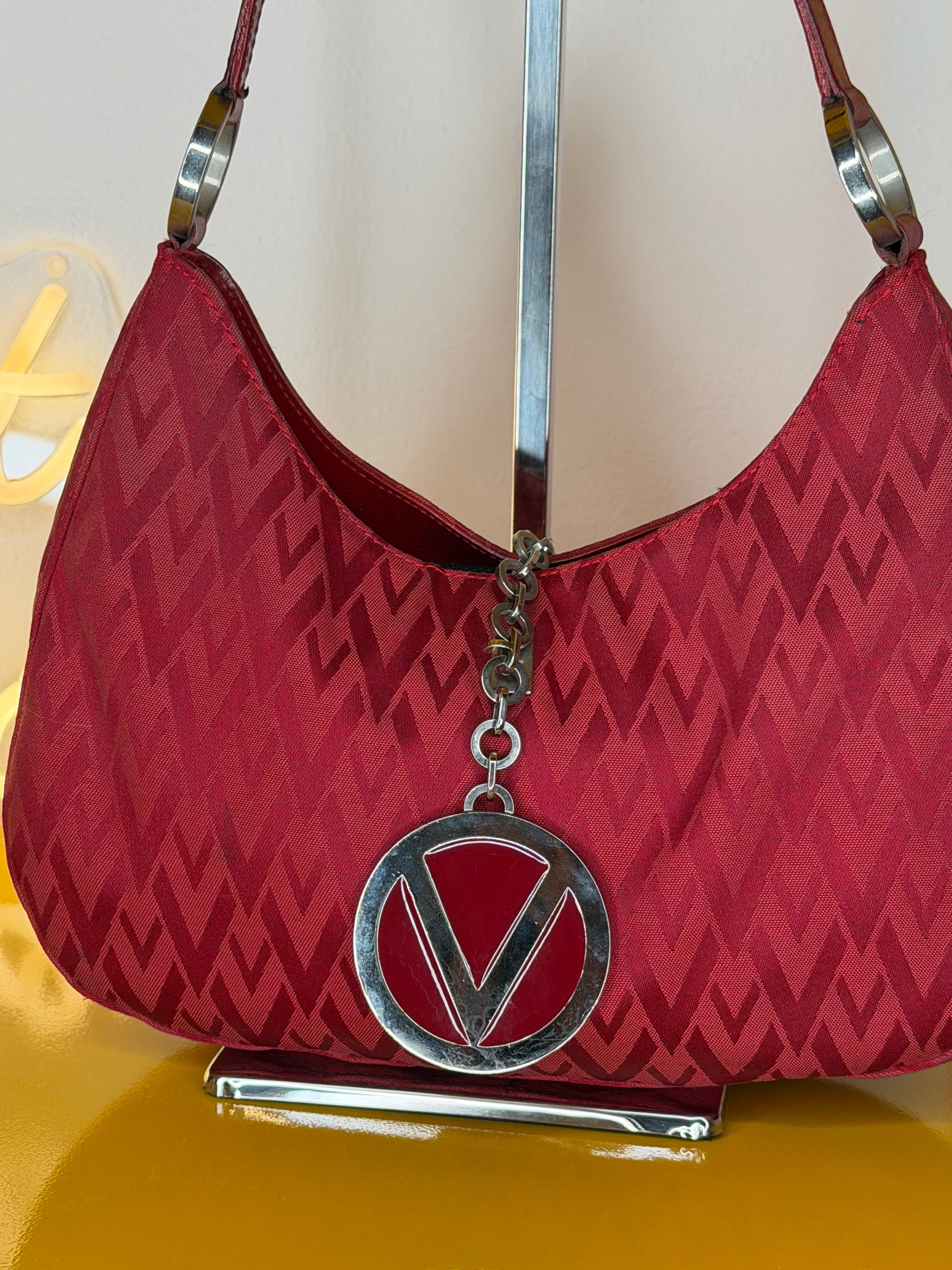 Bellissima borsa vintage Valentino hobo in tessuto trama Toute La V rossa, hardware argento e inserti in pelle rossa.